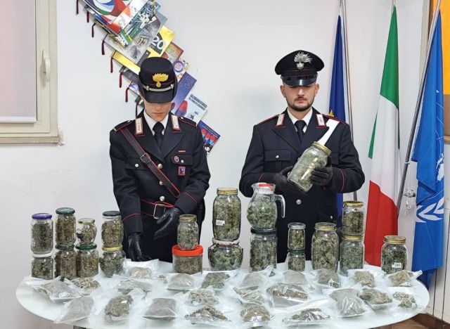 I Carabinieri della Stazione di Formello hanno arrestato un 30enne romano trovato in possesso di 4 grammi di marijuana durante un controllo. La perquisizione domiciliare ha rivelato ulteriori 1,7 kg della stessa sostanza, suddivisi in 21 barattoli e 23 buste sottovuoto, già pronte per la vendita.